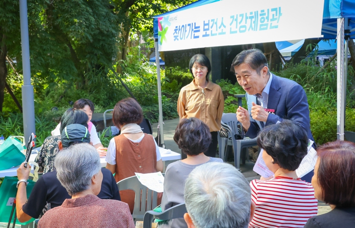| ▲ 10일 방배3동 방배그랑자이아파트에서 진행된 ‘찾아가는 보건소 건강체험관’에서 전성수 서초구청장이 주민들과 이야기를 나누고 있다. |