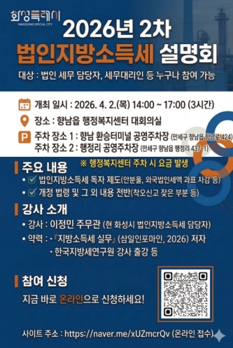 설명회는 화성시 관내 세무대리인은 물론 관심 있는 시민과 타 지자체 관계자 등 누구나 무료로 참여할 수 있다. 참가 인원은 원활한 운영을 위해 선착순 100명으로 제한되며, 신청은 네이버폼을 통해 접수하면 된다.