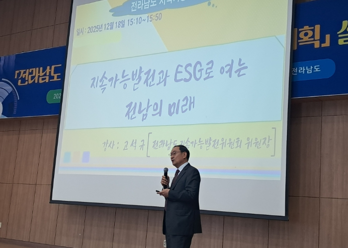 첫번째 강연자로 나선 고석규 전남도 지속가능발전위원장은 ‘지속가능발전과 ESG로 여는 전남의 미래’를 주제로 지속가능발전의 의미와 함께 전남도가 앞으로 나아가야 할 방향을 제시했다. 이어‘전라남도 지속가능발전 기본전략 및 추진계획’의 주요 내용과 추진체계에 대한 구체적 이해를 높이기 위한 전략 수립 배경, 향후 5년과 20년을 내다보는 중·장기 추진 과제 등을 소개했다.
