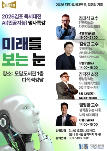 [파이낸셜경제=김기보 기자] 김포시는 ‘2026 김포 독서대전’의 일환으로 '미래를 보는 눈: 인공지능(AI) 명사 특강'을 오는 4월 17일부터 8월 8일까지 모담도서관에서 4회차로 운영한다.