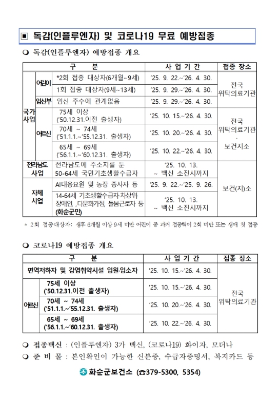 | ▲ 화순군, 인플루엔자(독감) 무료 예방접종 실시 |