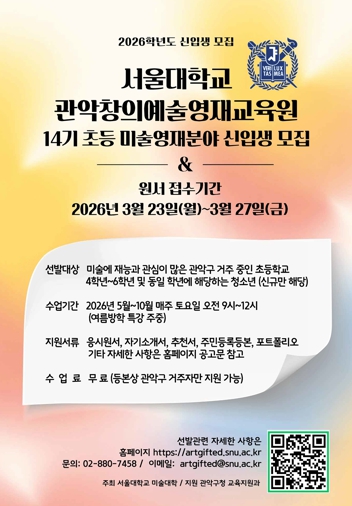 [파이낸셜경제=김예빈 기자] 관악구가 서울대학교 미술대학과 함께 학·관 협력 사업의 일환으로 운영하는 ‘관악창의예술영재교육원’의 제14기 신입생을 모집한다.