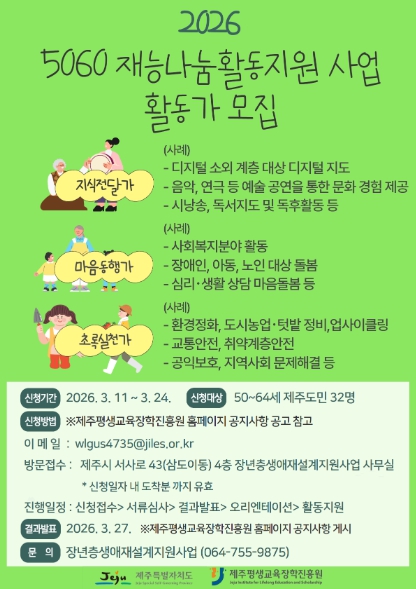 [파이낸셜경제=김영란 기자] (재)제주평생교육장학진흥원(원장 진희종)에서는 제주도민 50~64세 대상으로 ‘5060재능나눔 활동가’를 모집한다.