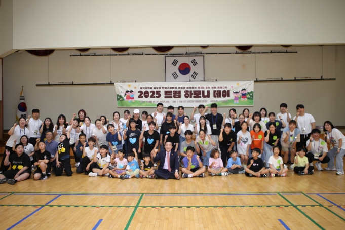 | ▲ 울산 청년봉사단 라온하제가 6일 북구 오토밸리복지센터 체육관에서 북구 드림스타트 가족 및 자원봉사자와 함께 하는 주말놀이활동 '드림 하모니데이'를 연 가운데 박천동 북구청장이 참여자들을 격려한 후 기념촬영을 하고 있다. |