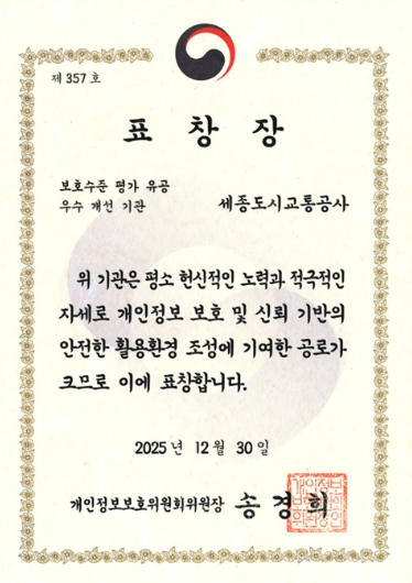 세종도시교통공사 도순구 사장은 “이번 우수 개선 기관 선정은 전년도 평가 결과를 철저히 분석하고, 전사적인 개선 노력을 지속해 온 결과”라며, “앞으로도 개인정보 보호를 공사의 핵심 가치로 삼아 시민의 소중한 개인정보를 더욱 안전하게 보호하고, 신뢰받는 공공기관으로 자리매김하겠다”고 밝혔다.