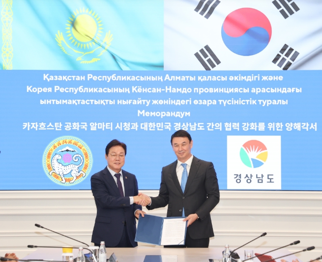 이날 경남도와 알마티시는 먼저 양 지역 간 관광‧산업‧문화‧교육‧행정 등 다방면에 걸친 국제교류 협력 강화를 위한 양해각서(MOU)를 체결했다. 이번 협약을 통해 양측은 지속가능한 지방정부 간 협력관계를 구축하고, 향후 다양한 분야로 교류를 확대해 나가기로 했다.