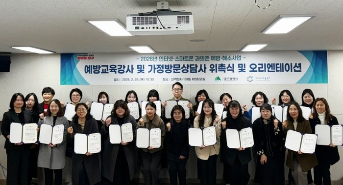[파이낸셜경제=김지훈 기자] 대구광역시는 2월 26일 시민들의 디지털 과의존을 예방하고 건전한 정보문화 확산을 이끌 ‘2026년 인터넷·스마트폰 과의존 예방교육강사 및 가정방문상담사 위촉식’을 개최했다.