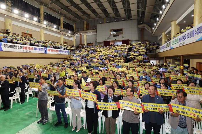 [파이낸셜경제=김예빈 기자] 무주군이 지난 1일 무주예체문화관 대강당에서 농어촌 기본소득 시범사업 선정을 촉구하는 범군민 결의대회를 개최했다.