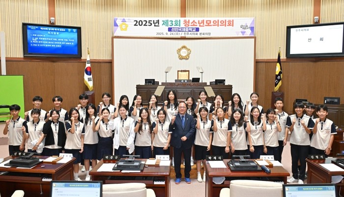 [파이낸셜경제=김예빈 기자] 진주시의회는 24일 본회의장에서 선인국제중학교 학생 31명이 참여한 가운데 ‘2025년 제3회 청소년 모의의회’를 개최했다.