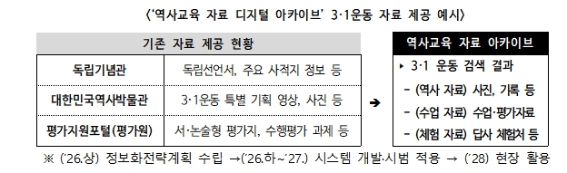 또한, 학생의 탐구 역량을 키우는 역사 수업 활성화를 위해 ‘탐구 중심 역사 교육과정 운영 사례집’(’26. 3종→’27. 9종)을 개발·보급한다. 더불어, 각종 기관·누리집(플랫폼) 등에 분산된 근현대 사료와 교육자료, 체험 자료 등을 수업에 즉시 활용할 수 있도록 교사에게 묶음(패키지) 형태로 제공하는 ‘역사교육 자료 아카이브’를 구축(ʹ27)할 예정이다.