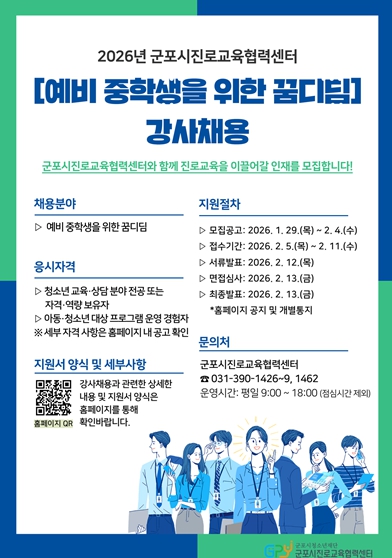 [파이낸셜경제=김기보 기자] (재)군포시청소년재단 군포시진로교육협력센터는 관내 예비중학생의 학교 적응과 진로 기초 역량 강화를 위해 '2026년 군포시진로교육협력센터 예비중학생을 위한 꿈디딤' 프로그램에 참여할 강사를 채용한다고 밝혔다.
