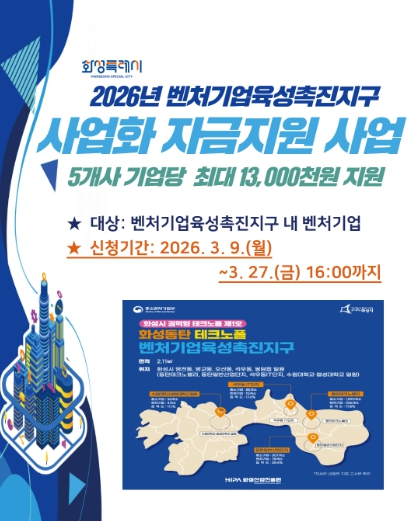 [파이낸셜경제=김기보 기자] 화성특례시와 화성산업진흥원(원장 전병선)은 화성동탄테크노폴 벤처기업육성촉진지구 내의 벤처기업의 성장을 지원하기 위해‘2026년 벤처기업육성촉진지구 사업화 자금지원 사업’ 참여기업을 오는 3월 27일까지 모집한다.