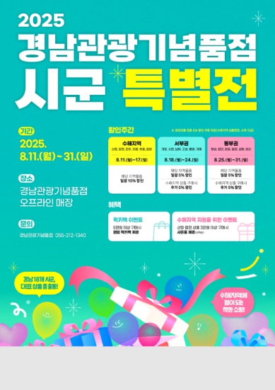 이번 특별전은 도내 각 시군의 특산품을 집중 소개하여 우수제품 홍보 및 판매증대를 위해 기획됐으며, 특히 수해피해지역인 산청·합천 등의 상생소비를 통한 지역 관광산업 회복에 기여한다는 취지로 마련됐다.