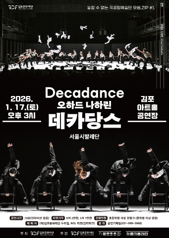 국공립예술단 공연 시리즈의 첫 무대를 선보일 서울시발레단의 ‘오하드 나하린 '데카당스'’ 공연은 1월 17일 15시 김포아트홀 공연장에서 개최될 예정이며, 세계적 안무가 오하드 나하린의 대표작들을 감각적인 시각 연출 및 다채로운 음악과 함께 서울시발레단만의 유연하고 독창적인 움직임을 통해 선보일 예정이다.