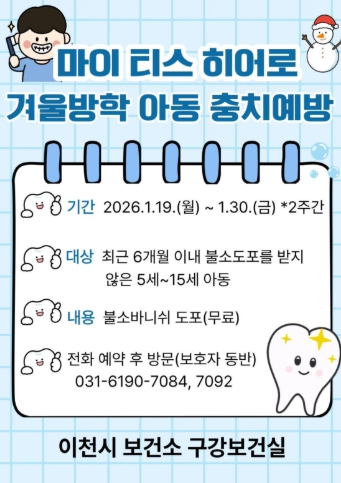 참여를 희망하는 보호자는 이천시 보건소 구강보건실로 전화 예약 후 사업 기간 내(2026. 1. 19. ~ 1. 30.) 아동과 함께 방문하면 된다.