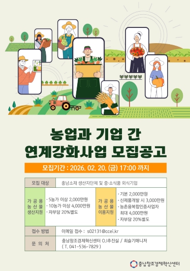 [파이낸셜경제=김영란 기자] (재)충남창조경제혁신센터는 ‘2026년 농업과 기업 간 연계강화 지원사업’ 참여 대상을 모집한다고 밝혔다.