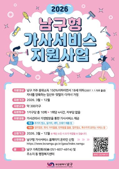 [파이낸셜경제=박영진 기자] 부산 남구는 임산부·맞벌이·다자녀 가정의 가사 부담을 완화하기 위해 '2026년 남구형 가사서비스 지원사업'을 3월 9일부터 시행한다고 밝혔다.