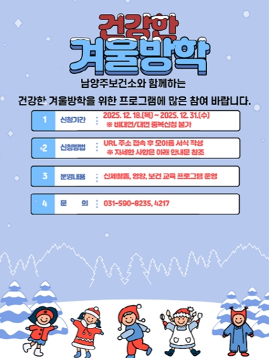 [파이낸셜경제=김기보 기자] 남양주보건소는 겨울방학 동안 관내 초등학생들을 대상으로‘초등학생이 건강한 겨울방학’프로그램을 이달 9일부터 내달 6일까지 4주간 운영한다고 7일 밝혔다.