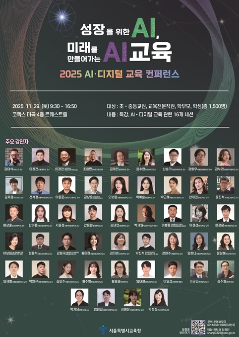 [파이낸셜경제=김영란 기자] 서울특별시교육청(교육감 정근식)은 AI 시대 학습자의 성장을 체계적으로 지원하고, 공교육이 나아가야 할 미래교육의 방향을 모색하기 위해 '2025 AI·디지털 교육 컨퍼런스'를 11월 29일 마곡 코엑스에서 개최한다.