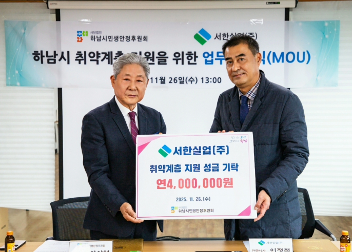 [파이낸셜경제=김기보 기자] 서한실업(주)와 하남시민생안정후원회는 11월26일 하남시 취약계층 지원을 위한 업무협약을 체결했다. 이번 협약을 통해 서한실업(주)는 연간 400만원 기탁하며 하남시의 이웃들을 위한 꾸준한 나눔 활동을 이어가기로 뜻을 모았다.