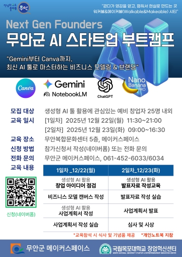 이번 부트캠프는 무안읍 메이커스페이스(일반랩)에서 예비 및 초기 창업자 25명을 대상으로 진행되며, ‘Gemini부터 Canva까지, 최신 AI 툴로 마스터하는 비즈니스 모델링 & 브랜딩’을 주제로 창업 아이디어 발굴부터 최종 사업계획서 작성, 모의 발표까지 실무 중심의 집중 교육이 이뤄질 예정이다.
