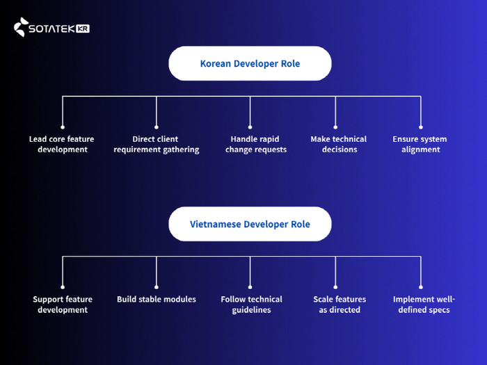 최근 국내 IT 업계에서는 한국 개발자와 베트남 개발자 간의 역할 분담이 더욱 명확해지는 추세다. 한국 개발자들은 핵심 기능 개발을 주도하며, 고객사로부터 요구사항을 직접 수집해 신속하게 대응하는 역할을 맡고 있다. 또한 기술적 의사결정을 수행하고 시스템의 전체적인 방향성을 관리하는 등 프로젝트의 전략적 중심축을 담당한다.