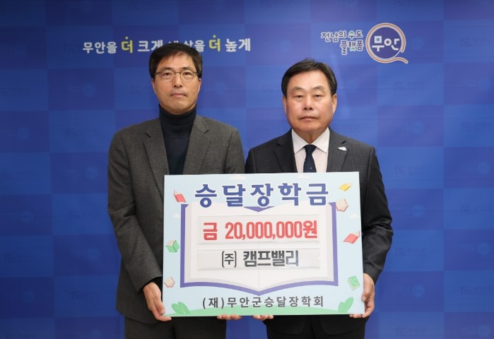 [파이낸셜경제=김예빈 기자] 전남 무안군은 지난 20일 주식회사 캠프밸리에서 지역 인재 육성을 위해 (재)무안군승달장학회에 장학금 2천만 원을 기탁했다고 밝혔다.