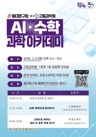 [파이낸셜경제=김예빈 기자] 서울 동대문구가 겨울방학을 맞아 홍릉에 자리한 고등과학원(KIAS)과 손잡고 ‘AI·수학 과학아카데미’를 연다. 아이 혼자 ‘학원’으로 향하는 대신, 부모와 함께 강연장을 찾아 같은 내용을 듣고 집으로 돌아가는 길에 자연스럽게 대화를 이어가게 하는 ‘가족 소통형’ 프로그램이다.