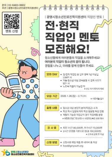 [파이낸셜경제=김기보 기자] 광명시청소년재단 청소년진로진학지원센터는 관내 청소년들에게 현실적인 직업 정보와 체계적인 진로 설계 기회를 제공하기 위해 ‘2026년 직업인 멘토’를 신규 모집한다고 밝혔다.