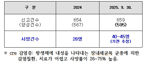 권혁열 의원이 강원도로부터 제출받은 감염병 검사 실적 및 양성 건수 자료에 따르면, 격리가 필요한 제2급 감염병인 CRE(장내세균목 균종에 의한 감염질환) 감염 사례가 최근 2년간 연평균 581건에 달했으며, *사망자 수도 2024년 28명(공식 집계)*에서 *2025년 9월 기준 40명(기관 추정)*으로 크게 증가한 것으로 나타났다.(※ 25년 사망자는 다음 해 최종 사인 판정 후 확정됨.)