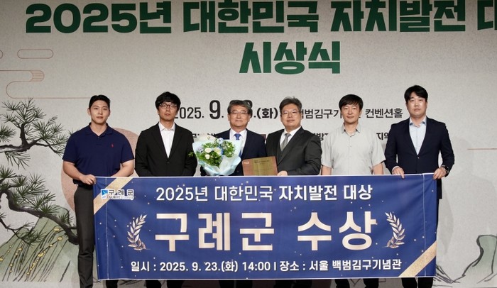 [파이낸셜경제=김예빈 기자] 전남 구례군은 9월 23일 서울 백범김구기념관에서 열린 ‘2025년 대한민국 자치발전 대상’ 시상식에서 기초자치단체 부문 대상을 수상하는 영예를 안았다. 전남 지자체 중에서는 구례군이 유일하게 수상했다.