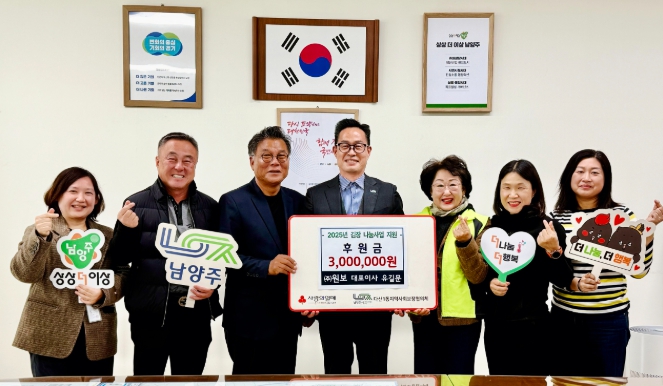 [파이낸셜경제=김기보 기자] 남양주시는 29일 ㈜원보(대표이사 유길문)가 다산1동 지역사회보장협의체(위원장 정순옥)에 김장 나눔 사업비로 300만 원을 지정기탁했다고 밝혔다.