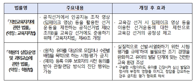 교육부는 이번 법률 개정을 통해, 공직선거에서 인공지능 조작 영상(딥페이크 영상) 등을 활용한 선거운동을 제한하는 '공직선거법' 제82조의8을 교육감 선거에도 준용하여 교육감 선거의 공정성을 높이고자 했다.