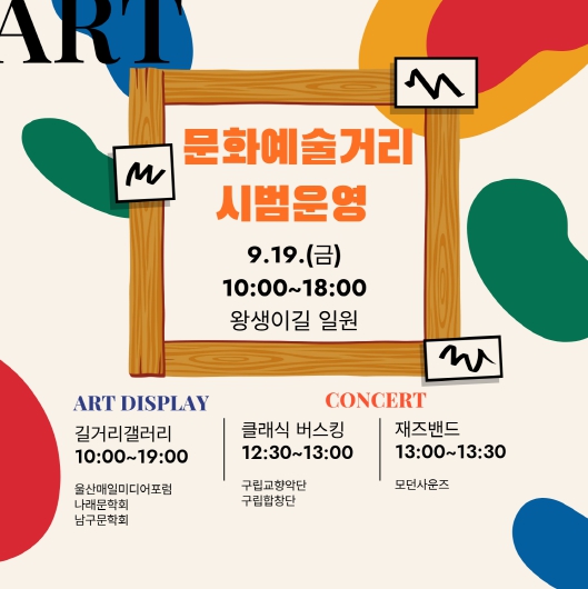 [파이낸셜경제=김예빈 기자] 울산 남구는 오는 9월 19일 오전 10시부터 오후 6시까지 왕생이길 일원과 구청 현관에서 문화예술거리 시범 운영을 실시한다고 밝혔다.
