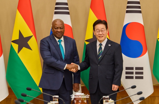 [파이낸셜경제=김예빈 기자] 이재명 대통령은 11일 오후 우리나라를 실무 방한한 존 드라마니 마하마 가나 대통령과 정상회담을 가졌다고 강유정 청와대 대변인이 서면 브리핑을 통해 밝혔다.