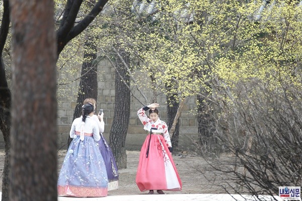 봄의 전령인 산수유가 서울,경복궁을 노랗게 물들인 가운데 한복을 곱게 차려입은 여학생들이 포즈를 취하고 있다.