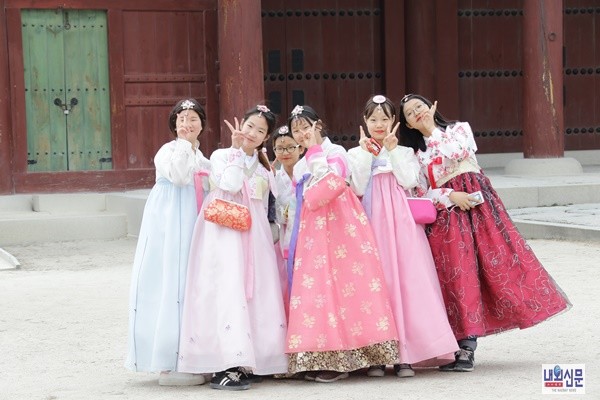 [파이낸셜경제=김봉화 기자] 만연한 봄의 향기가 넘치는 25일 서울,광화문 경복궁은 봄을 마중나온 인파들로 가득했다.25일 서울,경복궁을 찾은 초등학생들이 예쁜 한복을 입은채,취재진에게 예쁜 포즈를 취해주고 있다.