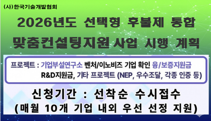 한국기술개발협회, 2026년도 선택형 후불제 통합맞춤컨설팅 지원사업 시행계획 공고