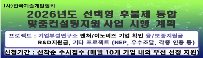 | » | 한국기술개발협회, 2026년도 선택형 후불제 통합맞춤컨설팅 지원사업 시행계획 공고 | 한국기술개발협 | 2025.11.27 | 118 |