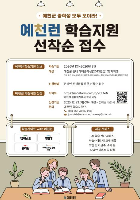 [파이낸셜경제=김지훈 기자] 예천군은 지역 청소년의 학습격차 해소와 자기주도학습 역량 강화를 위해 추진 중인 AI 기반 학습지원 사업 ‘예천런’에 참여할 예비 중학교 1학년 및 재학생을 추가 모집한다.