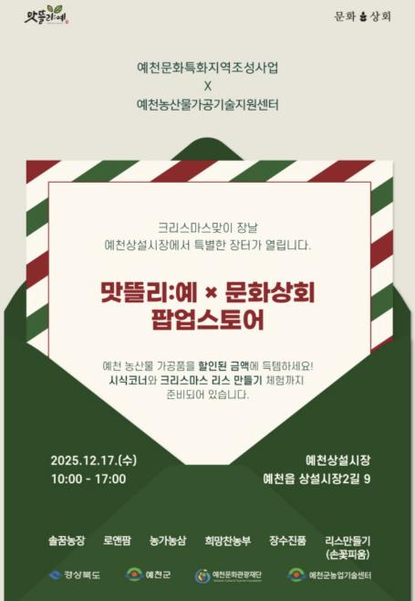 [파이낸셜경제=김지훈 기자] 예천군과 예천문화관광재단은 17일, 예천상설시장 ‘문화상회’에서 크리스마스를 맞아 ‘문화상회 X 맛뜰리:예’ 프로그램을 개최한다.