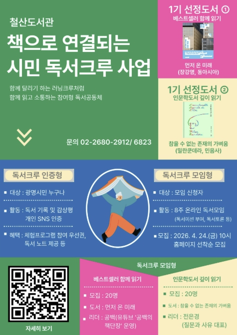 1기는 도서 유형별 20명씩 총 40명을 모집하며, 선정된 참여자들은 8주간 온라인 독서 미션을 실천하고 토론에 참여한다. 원활한 모임 참여를 위해 참여자는 철산도서관 종합자료실에서 모임 도서를 대출할 수 있다.