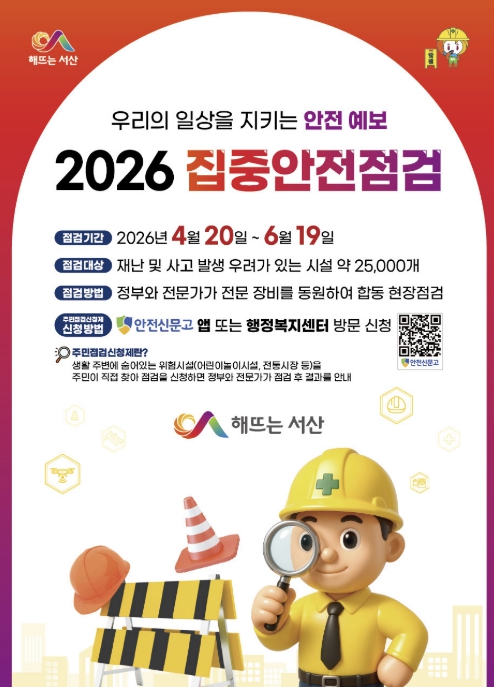 [파이낸셜경제=김영란 기자] 충남 서산시는 4월 20일부터 6월 19일까지 ‘2026년 집중안전점검’을 진행한다고 밝혔다.