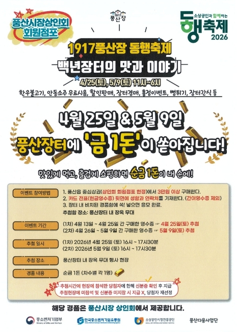 안동시 관계자는 “1917년부터 지역 경제의 중심 역할을 해온 풍산시장의 매력을 널리 알리고자 이번 축제를 기획했다”며, “맛있는 먹거리와 즐거운 쇼핑, 그리고 순금의 행운까지 함께하는 풍산장터에서 백년 장터의 깊은 맛과 이야기를 만끽하시길 바란다”고 전했다.