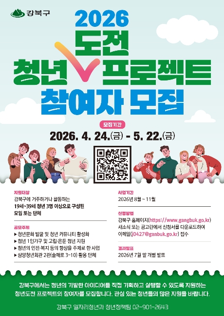 [파이낸셜경제=김예빈 기자] 서울 강북구는 청년들의 창의적인 아이디어를 지역사회에서 실현할 수 있도록 돕는 ‘2026년 청년도전 프로젝트’ 참여자를 모집한다고 밝혔다.