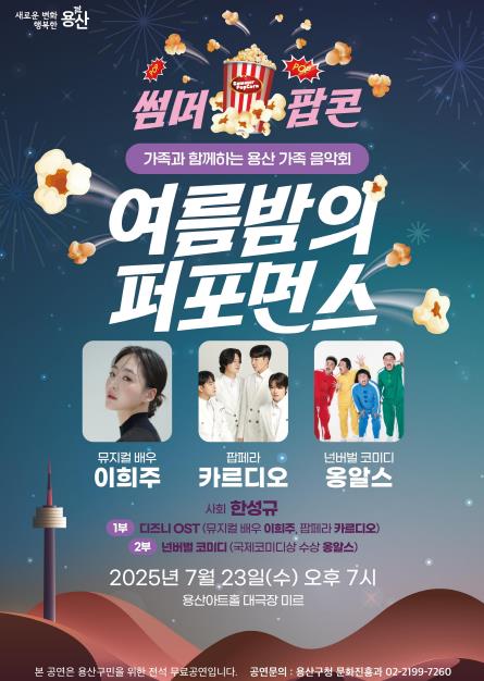[파이낸셜경제=김예빈 기자] 서울 용산구가 오는 23일 오후 7시 용산아트홀(녹사평대로 150) 대극장 미르에서 여름맞이 기획공연 ‘썸머팝콘: 여름밤의 퍼포먼스’를 개최한다.