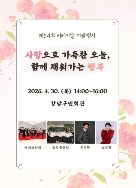 [파이낸셜경제=김예빈 기자] 꿈이 모이는 도시, 미래를 그리는 강남구가 제54회 어버이날을 맞아 4월 30일 오후 2시부터 4시까지 강남구민회관에서 기념행사를 개최하고, 5월 8일에는 7개 노인복지관에서 다채로운 행사를 이어간다.