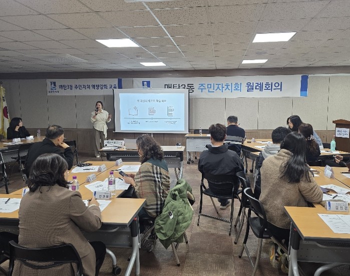 교육은 4월 20일 매탄3동을 시작으로 6월 25일 서둔동까지 순차적으로 진행한다. 동별로 전문 강사가 찾아가 참여형 교육을 운영한다. 이번 과정은 주민자치회 활동에 바로 적용할 수 있도록 실습과 분임 토의를 중심으로 구성했다.