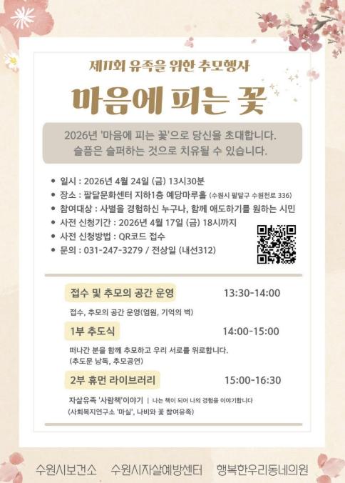 [파이낸셜경제=김기보 기자] 수원시자살예방센터가 24일 오후 1시 30분 팔달문화센터 예당마루홀에서 유족을 위한 추모행사 ‘제11회 마음에 피는 꽃’을 연다.