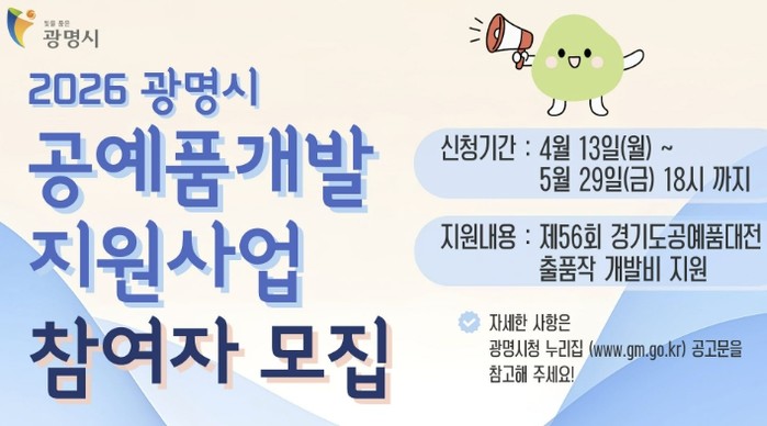 시는 제56회 경기도 공예품대전에 출품하기 위해 공예품을 제작하는 업체·개인에 제작비를 지원하는 ‘2026년 공예품개발 지원사업’ 참여자를 오는 5월 29일까지 모집한다.